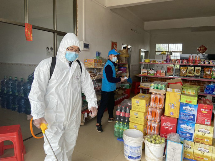 由項目團(tuán)青年組成的疫情防控志愿者服務(wù)隊整裝待發(fā),在與當(dāng)?shù)厣鐓^(qū)取得聯(lián)系后,籌備了一次性口罩、一次性手套等防疫物資分發(fā)到社區(qū)的每個執(zhí)勤崗位上,并有序組織志愿者為當(dāng)?shù)厣鐓^(qū)人員活動密集場所進(jìn)行消毒。