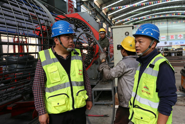 圖為楊鵬濤(左)在檢查鋼筋加工廠生產(chǎn)情況 說起建設拌合站的難度,楊鵬濤深有感觸。工地沒電、沒水,他和兩名老職工、兩名民工,每天早晨6點半吃完早餐,就帶著兩瓶開水上工地,晚上十一、二點才回項目部,在工地吃了兩個多月的盒飯。拌合站一開工就遇到梅雨季節(jié),為了趕工期,幾乎天天冒雨作業(yè)。下雨時就打傘或穿雨衣指揮機械作業(yè),小雨不停施工,大雨就排水,在建設拌合站期間,楊鵬濤沒有離開過工地半步,他一個人就用壞了4把雨傘。高峰時共有14臺挖機、裝載機3臺、壓路機1臺,自卸車7、8臺投入施工。他怕一離開現(xiàn)場,這么多機械車輛窩工,會給項目部造成損失。他說:“現(xiàn)場管理人員,在與不在工地,施工效率肯定是不一樣的。”