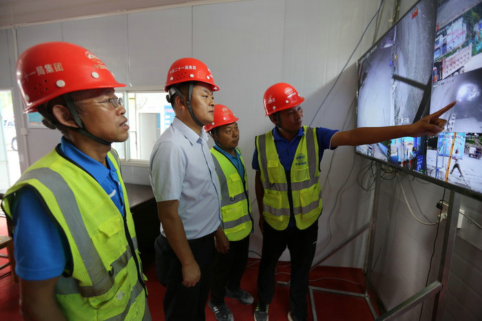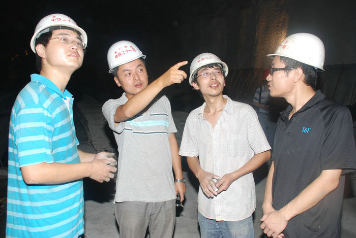 王亞輝(左二)與現(xiàn)場(chǎng)管理人員、技術(shù)人員觀看洞內(nèi)監(jiān)控情況一個(gè)項(xiàng)目的成敗,前期策劃是關(guān)鍵。為此,王亞輝和經(jīng)理王永奇對(duì)現(xiàn)場(chǎng)詳細(xì)踏勘了十幾次,并邀請(qǐng)公司、集團(tuán)公司及外部專家到現(xiàn)場(chǎng)指導(dǎo),明確了項(xiàng)目的關(guān)鍵線路為架梁通道,控制性工程為陳平互通360萬方挖方,填方240萬方。