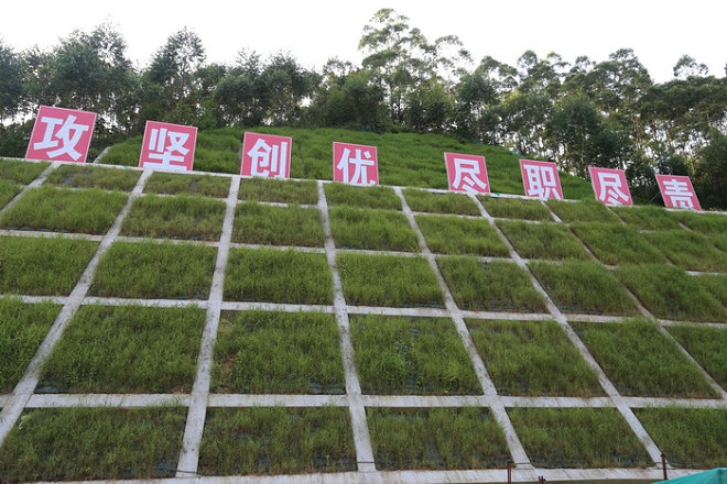 大橋架梁后準(zhǔn)備橋面系施工今年春節(jié)后,國家環(huán)保局進(jìn)駐廣西,六賓高速環(huán)保要求嚴(yán)。南國山清水秀,植被茂盛,沒有裸露的山體,為了保護(hù)綠水青山,前期項(xiàng)目部施工就制定了路基高邊坡開挖、綠化同時(shí)進(jìn)行的施工方案。王亞輝不辭辛勞,每天都要去現(xiàn)場(chǎng)巡視,檢查掛網(wǎng)噴草施工情況。如今路基還正在施工,高邊坡兩側(cè)也是綠草茂盛,與翠綠的山林渾然一體。