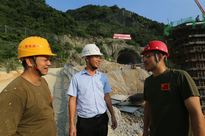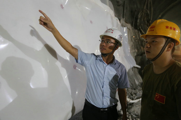余濤(左)檢查隧道邊墻鋪設(shè)防水板
