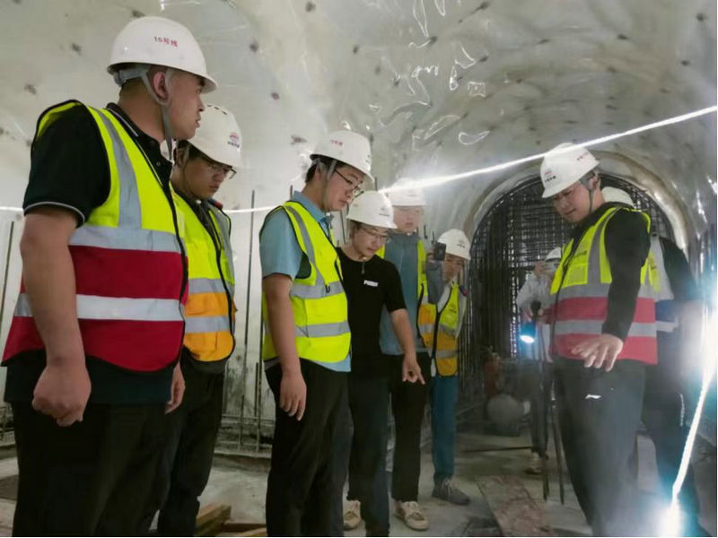 項目部總工程師李文慶(左三)與項目經(jīng)理阮超(右一)現(xiàn)場副經(jīng)理宋利(左一)在盾構聯(lián)絡通道施工進行質量、安全檢查指導