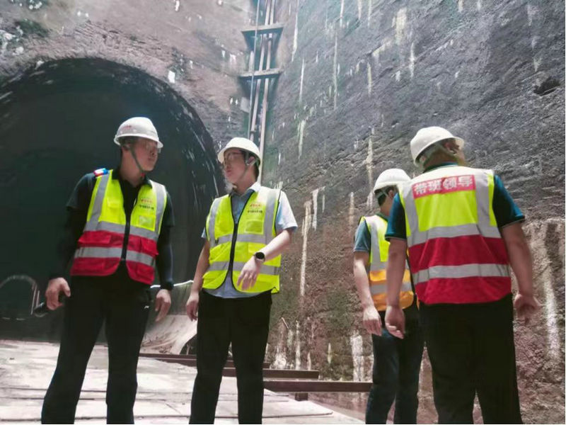 項目總工程師李文慶(左二)與項目經(jīng)理阮超(左一)等相關領導進行隧道施工月度綜合檢查