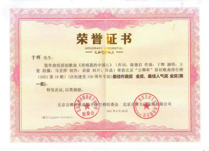 于輝的創(chuàng)作始終緊扣時(shí)代脈搏,多部作品在重大主題征集活動中脫穎而出。2021年建黨百年之際,他創(chuàng)作的《尋你的路是一座座青山》《再唱我的中國心》雙獲中共河南省委宣傳部等單位聯(lián)合評選的金獎(jiǎng),其中《再唱我的中國心》更持續(xù)發(fā)力,后續(xù)斬獲中國國際教育電視臺金獎(jiǎng)、教育部白名單賽事銀獎(jiǎng)等多項(xiàng)榮譽(yù),成為跨年度傳播的主旋律佳作 。