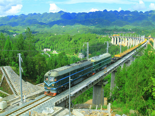 雙機(jī)牽引的首列長(zhǎng)軌車(chē)運(yùn)行在鐵爐堡特大橋上