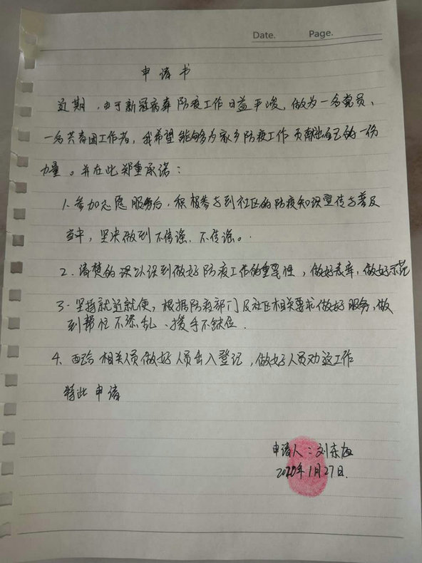 。在隔離期滿后多次溝通社區(qū)希望能夠成為一名防疫志愿者,并參與協(xié)助社區(qū)、小區(qū)物業(yè)做好外地返鄉(xiāng)人員排查登記,在小區(qū)勸返點(diǎn)疫情把控上,堅(jiān)決執(zhí)行“一測(cè)、雙查、三核”(即對(duì)進(jìn)出人員測(cè)量體溫;查身份證、出入證; 核對(duì)人員身份、核對(duì)小區(qū)業(yè)主臺(tái)賬及未返人員臺(tái)賬)。