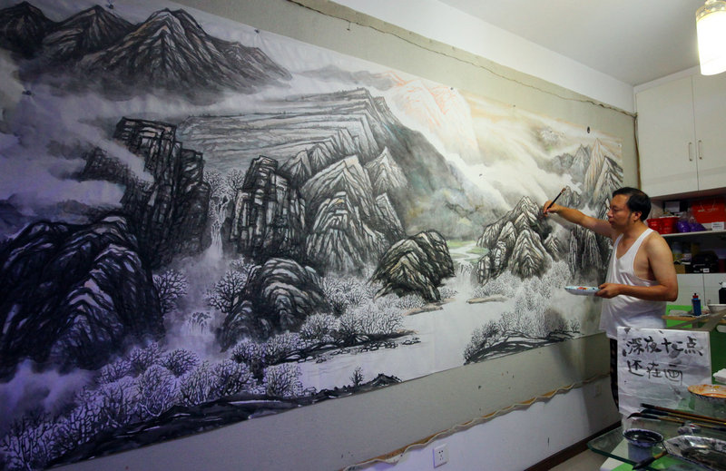 中國的高鐵建設(shè)方興未艾,高鐵建設(shè)者正奔波于祖國的四面八方,就拿我們公司來講,短短幾年的時間里,先后參建了鄭西、石武、滬昆、哈齊、湘桂、貴廣、南廣、廈深等十多條高速鐵路建設(shè)。伴隨高鐵施工的大發(fā)展,表現(xiàn)高速鐵路建設(shè)的宏偉畫卷也在每一位大路畫家的心中開始琢磨起來。2010年秋天,石武高速鐵路施工迎來施工大干高潮,我和單位同事一道,離開公司機(jī)關(guān),輾轉(zhuǎn)千里,來到湖北與河南交界的大悟縣,施工大干之際,我一邊工作,一邊用隨身的小本畫工地速寫,工余時間就在宿舍畫工地小景,在工地上雖然畫畫的條件不太寬裕,單弄一塊土工布代替羊毛氈,放在桌子上依然能夠解決畫國畫的基本需求,就這樣,幾個月下來,居然還有不少收獲,一幅幅再現(xiàn)高速鐵路建設(shè)的山水畫躍然紙上,其中一幅畫還被《中國鐵道建筑報》評為了年度優(yōu)秀美術(shù)作品獎。