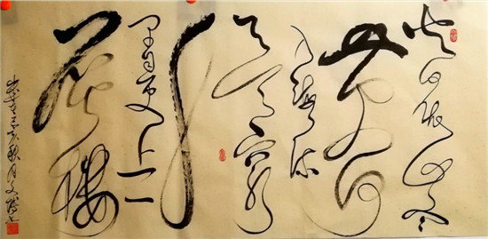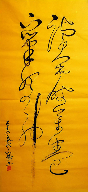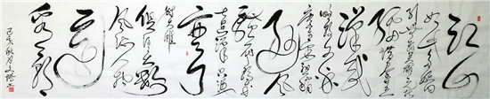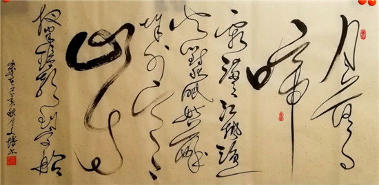 文博遍訪名師,書法功底深厚,其創(chuàng)作奔放自由,法度嚴謹,喜歡直抒胸臆,無論何時何地,素紙鋪開,濃蘸筆墨,下筆行云流水,神采飛揚,筆鋒上下游動,左右擒縱,點畫無一處含糊懈怠,法度盡在指腕之間,厚重而不失飄逸,靈動而不失莊重。