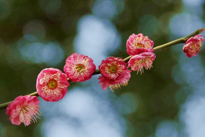 早春二月,北方有時天上還飄著雪花,甚至是鵝毛大雪,冬天下的雪還沒消融,地凍三尺,不管走到哪里,環(huán)顧四周,光禿禿一片荒涼,即使種植小麥的田野里,一兩寸高的小麥苗在寒風(fēng)中被凍的瑟瑟發(fā)抖,趴在地上不敢動彈。西北風(fēng)卷著枯枝敗葉漫天飛舞,所到之處塵煙彌漫,不可一世,人們叫苦不迭。而地處南方的海濱城市寧波便不一樣了,年前還冷得縮手縮腳,羽絨服加身還感覺不暖和,年后天氣突然轉(zhuǎn)暖,鮮艷欲滴的白色、粉色、紅色的梅花一夜之間開遍城市大街小巷、公園、生態(tài)園,開遍農(nóng)村的庭院、田間地頭,十分耀眼。春節(jié)期間,人們穿著時尚的衣服,三三兩兩、一群一伙地出現(xiàn)在公園、植物園、生態(tài)園踏春,賞花,盡情地享受春天的美麗,躺在墨綠色的草坪上,天馬行空地暢想未來,背誦幾首與春天有關(guān)的唐詩、宋詞,將詩詞與美麗的大自然融為一體。仰望藍(lán)天白云,吮吸著花草撲鼻的清香,渾身感覺十分愜意。身穿漂亮衣服的少男少女,走進(jìn)花叢擺出各種姿勢,攝影師不停按動相機(jī)快門,在機(jī)械的咔嚓咔嚓聲中,將一個個亮麗的瞬間定格于此,將一張張靚照分享給親愛的家人和朋友,將人生演繹的精彩紛呈。
