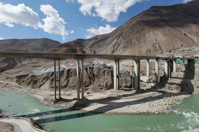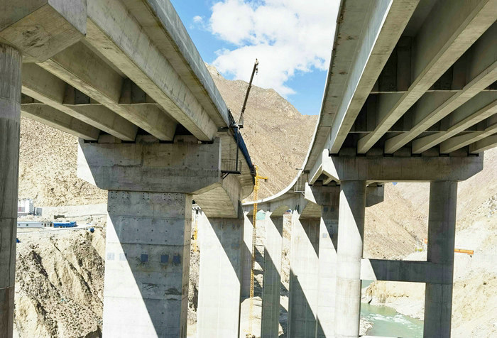 中鐵十五局集團(tuán)雅葉高速拉日十標(biāo)項(xiàng)目雅魯藏布江大橋位于拉薩市尼木縣卡如鄉(xiāng)卡如村西側(cè)約700米,以近東西走向跨越雅魯藏布江。大橋?yàn)樽笥揖€分離式,單幅橋?qū)?2.75米,公路等級(jí)為高速公路雙向4車道,設(shè)計(jì)速度100km/h,車輛荷載等級(jí)為公路Ⅰ級(jí)。橋梁下部結(jié)構(gòu)采用柱式墩、實(shí)心薄壁墩、空心薄壁墩、雙肢等截面矩形實(shí)體薄壁墩,橋臺(tái)為樁柱式橋臺(tái),基礎(chǔ)結(jié)構(gòu)采用樁基礎(chǔ)。左線橋梁全長734.5m,右線橋梁全長725.5m。其中主橋采用變截面預(yù)應(yīng)力混凝土連續(xù)剛構(gòu),兩岸引橋結(jié)合地形條件采用30m預(yù)應(yīng)力混凝土先簡支后橋面連續(xù)小箱梁和40m預(yù)應(yīng)力混凝土先簡支后橋面連續(xù)T梁。兩岸的橋墩位位于河谷陡峭河岸邊坡上,墩身較高、現(xiàn)澆段跨度較大,橋面橫風(fēng)較大橋面系工程存在高空作業(yè),安全風(fēng)險(xiǎn)較高。目前大橋已經(jīng)架通,為下一步完成全面建設(shè)任務(wù)進(jìn)了一大步。