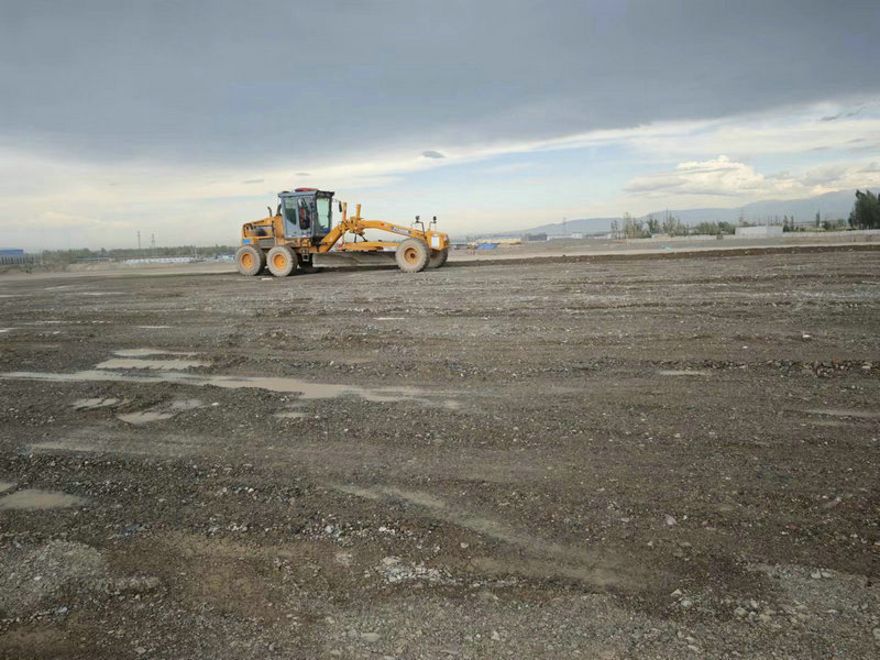 圖為新疆兵團建工水電集團市政路橋公司第五師雙河市G577沙山子-G219線公路(互通立交工程)RAK0+960-RAK0+800平地機整平。(王小丫 攝)