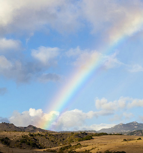 夕陽映照彩虹飛,山嵐繚繞天山巍。