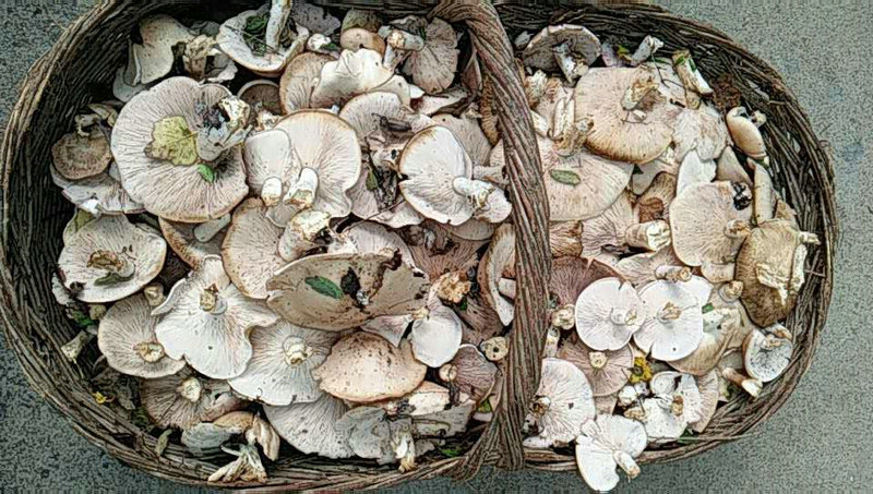 家鄉(xiāng)的駝梁山,自然資源豐富,多年來,鄉(xiāng)親們依靠資源改善貧窮的生活現(xiàn)狀。野生蘑菇是山里常見的一種山珍,備受人們的青睞。野生蘑菇又稱野生菌,種類多,白銀盤、紅銀盤、香心、羊眼、華林、雞腿、地雞、地花等等。每年的8月上旬到9月上旬,是野生蘑菇生長的季節(jié)。駝梁山地區(qū)上半年雨水少,下半年雨水多。松、樺、楊、柳等叢林間年復(fù)一年,積淀了厚厚的落葉,在充足的雨水浸潤下,下面的腐爛后變成黑色的泥土,上面是近兩年落的葉子。由樹葉蛻變的泥土,適宜自然生長菌類植物,不同的樹林生長著不同的蘑菇。五六年以前,人們還沒意識到野生蘑菇有抗癌、降壓、長壽等功效,所以山里的蘑菇基本都是村里人去采,吃獨食,哪一家院子里都晾曬著一大片蘑菇,被晾干的蘑菇總有一二十斤,送親友、炒菜、燉菜、蘑菇炒面、賣錢等等,都能派上用場,沒覺得有什么可貴之處。我在家鄉(xiāng)生活16年,大概七八歲起,到了野生蘑菇收獲的季節(jié),便跟著大人或與哥哥姐姐們一道進山里采,有時一個上午便能采到幾十斤。蘑菇味道鮮美,10多米外便能嗅到其獨特的香味。下雨天蘑菇長得快,今天林中看不到蘑菇的蹤影,一場夜雨便長出10多厘米高的蘑菇,他們排成曲曲彎彎的一兩米、兩三米長的陣形,像打傘的一群孩子,十分可愛。所以村