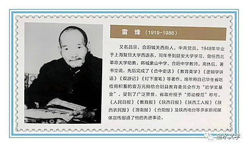 注:雷烽(1919-1986) 又名昌宗,陜西省合陽縣城關(guān)西街人,中共黨員。1948年畢業(yè)于上海復(fù)旦大學(xué)西語系,同年冬到延安大學(xué)學(xué)習(xí),曾任西北革命大學(xué)助數(shù),韓城象山中學(xué),合陽中學(xué)教師。離休后,著書立說,先后完成了《合中史話》《教育美學(xué)》《邏輯學(xué)進(jìn)話》《雙游記》《燈下漫筆》等著作。晚年將自己畢生省吃儉用積蓄的壹萬元捐給合陽縣教育委員會作為“勸學(xué)獎(jiǎng)基金”,受到了廣泛贊譽(yù),省政府授予“勞動(dòng)極范”稱號。《人民日報(bào)》《教育報(bào)》《陜西日報(bào)》《陜西工人報(bào)》《陜西農(nóng)民報(bào)》《渭南報(bào)》《合陽報(bào)》及陜西電臺等多家新聞媒體宣傳報(bào)道了他的先進(jìn)事跡。
