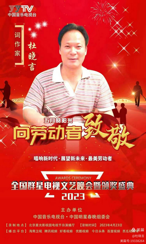 杜曉言,軍旅詞作家,騰訊音樂人,中國音樂著作權(quán)協(xié)會會員,傳略收入《鄆城名人大詞典》《詞曲中國藝術(shù)人才庫》等。1962年11月山東鄆城生人。1981年10月參加鐵道兵,1984年1月隨鐵道兵集體兵轉(zhuǎn)工。迄今在央視、省市級電視臺演唱作詞歌曲20余首。在國家級和省部級刊物發(fā)表歌詞500余首。多首作詞歌曲在社會廣泛流傳,多首作詞歌曲改編葫蘆絲名曲,多首作詞歌曲參加大型文藝晚會并獲獎,多首作詞歌曲收入大學(xué)音樂教材,多首作詞歌曲入選影視劇主題歌曲,著有多部歌詞集。