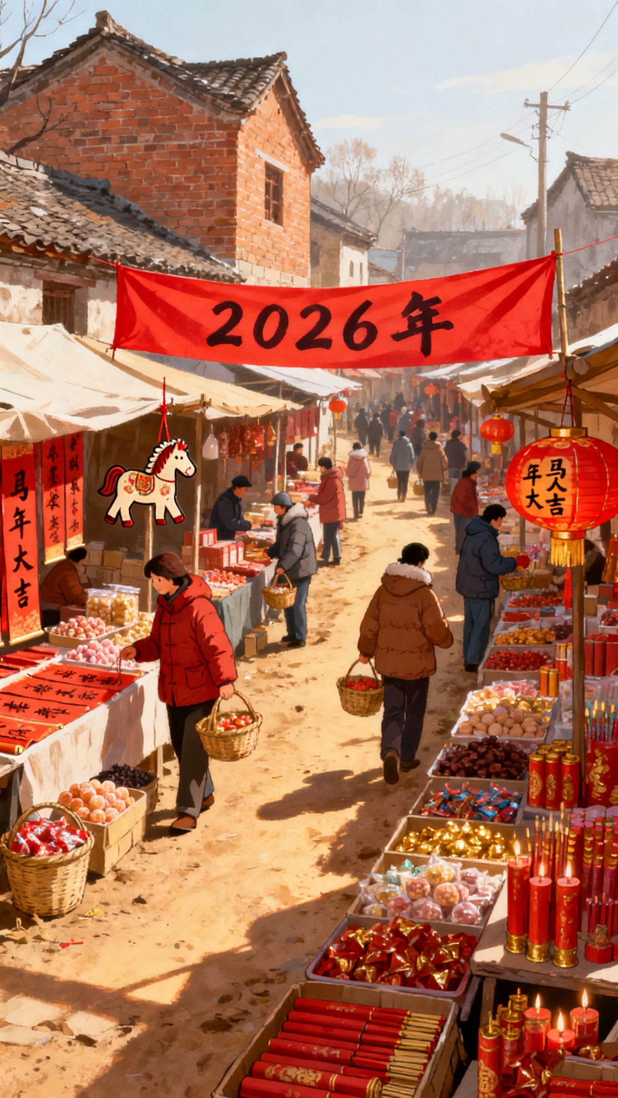 集市深處,最美的當(dāng)屬賣春聯(lián)的攤位,大紅的春聯(lián)、燙金的福字、鮮艷的窗花層層疊疊鋪開,像一片燃燒的紅云,紅紅火火映亮了半條街。攤主揮毫潑墨,龍飛鳳舞的字跡引得路人駐足叫好,鄉(xiāng)親們捧著剛挑好的春聯(lián),眉眼間的笑意更濃了。要是趕巧,集市西頭的戲臺(tái)上還搭著唱大戲的班子,胡琴聲、梆子聲伴著演員們字正腔圓的唱腔,引得里三層外三層的鄉(xiāng)親們仰頭喝彩,連小販們都忍不住停下吆喝,跟著哼上幾句。往年喧鬧的鞭炮攤不見了蹤影,取而代之的是掛滿電子鞭炮和生肖掛飾的攤位,LED彩燈隨聲閃爍,既添喜氣又護(hù)藍(lán)天。臨街飯店飄出蒸碗的香氣,門市的春聯(lián)福字紅得耀眼,熟人碰面老遠(yuǎn)揚(yáng)手:“趕集辦年貨嘞,備齊了沒?”熱絡(luò)的鄉(xiāng)音裹著煙火氣,在集市上空蕩開。