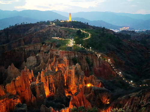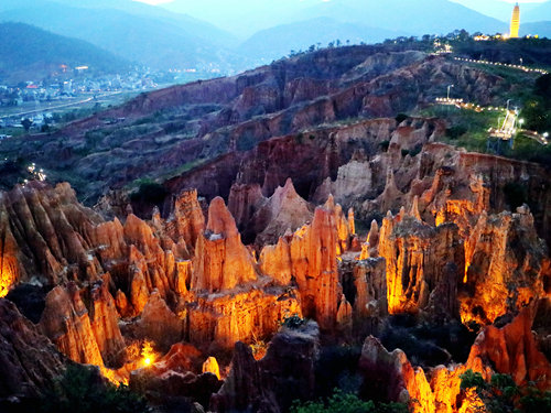 土林是一種獨特的流水侵蝕地貌,是水土流失現(xiàn)象造成的“美麗錯誤”。她的景觀會在不同季節(jié)、不同時間、不同氣候、不同角度有不同的韻味。陽光下的土林造型硬朗、醒目;雨霧中的土林若明若暗,朦朧含蓄;冬季的土林溫暖如春,夏季的土林炎熱酷暑。而且由于土林穩(wěn)定性差,易于流失,所以有些土柱今年似雞,明年似狗,充滿了變幻的美。土林是上天賜給南澗的一個寶貝,千百年來,她一直在南澗縣城附近期待著人們?nèi)バ蕾p。