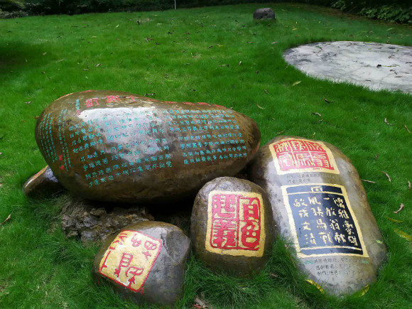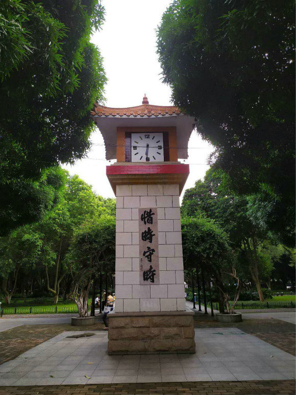 走在百色的街道上,看著工藝品店中美麗的民族服飾、手工繡球、壯錦、銅鼓等地方特色的文化遺產(chǎn),不禁為百色的多元民族民俗文化感到自豪。繼續(xù)漫步前行,來到了坐落在百色市右江區(qū)中山二路的人民公園。古樸的公園門樓安靜地聳立在傍晚的街區(qū),不多的居民與游人緩步行走在石板道上。公園不大,特有的植被高大、茂密,公園內(nèi)不多的游樂設施星布在道路兩側。在公園中心地帶的草地上,有幾塊百色印社雕刻的原石,刻有印社二十年軌跡、“百色起義”、“放翁鐵馬秋風”等字。在公園正門內(nèi)有一個鐘塔,除了上面的鐘表外,在塔身上刻有“惜時守時”四個字。百色人民公園為周邊的民眾提供休閑休息的場所,沒有現(xiàn)代化的游樂設施,有的只是南疆特有的靜謐與沉靜。
