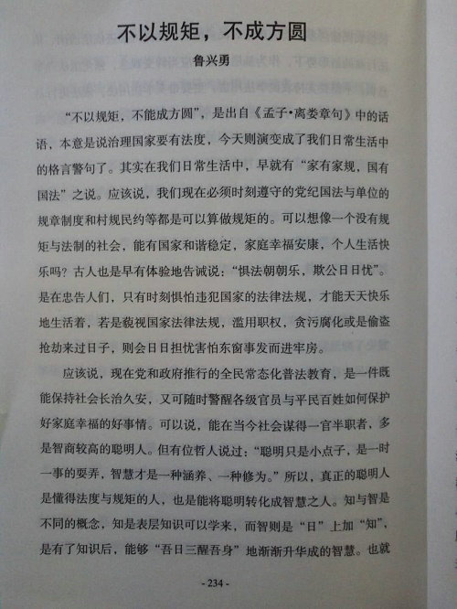 應(yīng)該說現(xiàn)在黨和政府推行的全民常態(tài)化普法教育,是一件既能保持社會長治久安,又可隨時警醒各級官員與平民百姓如何保護(hù)好家庭幸福的好事情??梢哉f能在當(dāng)今社會謀得一官半職者,多是智商較高的聰明人。但有位哲人說過:“聰明只是小點子,是一時一事的耍弄,智慧才是一種涵養(yǎng)、一種修為。”所以真正的聰明人是懂得法度與規(guī)矩的人,也是能將聰明轉(zhuǎn)化成智慧之人。知與智是不同的概念,知是表層知識可以學(xué)來,而智則是“日”上加“知”,是有了知識后,能夠“吾日三醒吾身”地漸漸升華成的智慧。也就是說既要學(xué)法懂法,還會用所學(xué)的法律法規(guī)來約束自己才是。