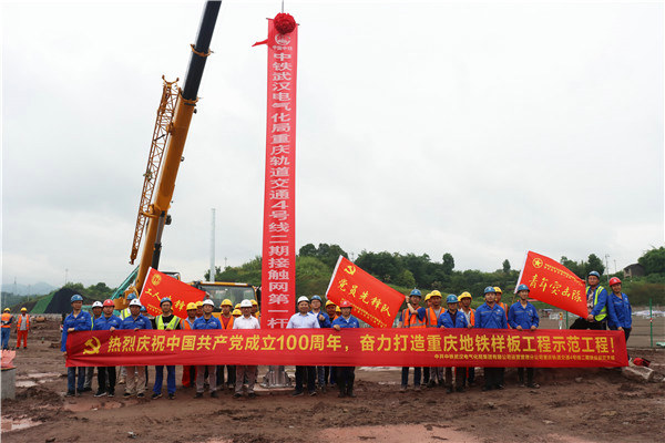 圖:5月15日,重慶軌道交通4號(hào)線二期站后系統(tǒng)設(shè)備2標(biāo)成功組立接觸網(wǎng)第一桿。韓秋攝