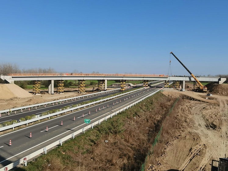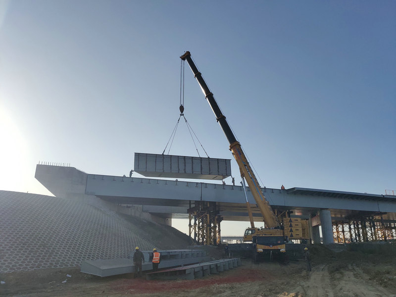 上跨高速施工,車流量大,施工期間需同時(shí)保證車輛正常有序通行,這也成為施工中的一大難點(diǎn)。自2021年9月27日首片鋼箱梁成功架設(shè)至今,歷時(shí)48天,中間經(jīng)歷國(guó)慶長(zhǎng)假和降雨天氣影響,為確保鋼箱梁順利、安全架設(shè),項(xiàng)目公司、總監(jiān)辦、駐地辦、總包部、項(xiàng)目部多次召開(kāi)施工技術(shù)交底會(huì)及安全交底會(huì),嚴(yán)格按照鋼箱梁施工方案布置場(chǎng)地、選擇吊機(jī)吊具、明確人員分工、制定應(yīng)急處理預(yù)案,嚴(yán)控鋼箱梁安裝過(guò)程中的安全質(zhì)量,各級(jí)領(lǐng)導(dǎo)多次親臨現(xiàn)場(chǎng)指導(dǎo),路政交警全程保通,有力保障了鋼箱梁吊裝的順利完成。