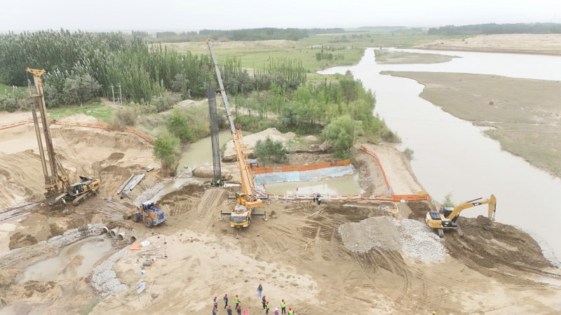 “突發(fā)的融雪洪水讓河道水位驟漲近2米,工程部和安全部要迅速劃定可能被損毀的施工區(qū)域,其他人員機械撤離到可把控、可操作區(qū)域,首先要保證人員機械安全。”項目負責人目測河道水位說道。面對突如其來的汛情,該項目部迅速啟動應(yīng)急預(yù)案,第一時間組織人員、機械和物資,采用賓格石籠和沙袋相結(jié)合的方式,在樁基外圍的河道兩側(cè)緊急構(gòu)筑防洪堤,有效阻擋洪水對施工區(qū)域的沖擊,確保樁基作業(yè)不受影響,既保證防洪堤的穩(wěn)固性,又保證施工效率。
