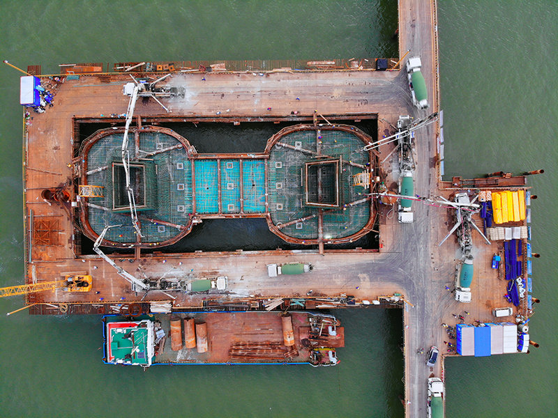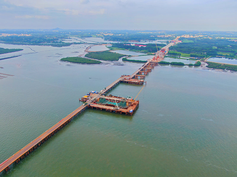 由于大橋?yàn)榭绾4髽?,為確保工程質(zhì)量,承臺(tái)鋼筋全都采用其抗腐蝕性強(qiáng)、耐久性好的環(huán)氧鋼筋;大橋共需混凝土總方量約36萬方,均采用海工高性能耐久混凝土。在施工中,中鐵大橋局克服地質(zhì)條件復(fù)雜、海上施工環(huán)境惡劣、臺(tái)風(fēng)影響頻次高、征拆協(xié)調(diào)難度大等困難,發(fā)揮建橋國家隊(duì)的技術(shù)和管理優(yōu)勢,加強(qiáng)超前謀劃,不斷優(yōu)化方案,強(qiáng)化技術(shù)管控,積極融入項(xiàng)目征拆,有力的促進(jìn)了工程進(jìn)展。目前,大橋項(xiàng)目路基、涵洞、主橋樁基、承臺(tái)及引橋樁基、下部結(jié)構(gòu)、上部結(jié)構(gòu)、箱梁架設(shè)均已展開施工,項(xiàng)目開累完成投資近40%。
